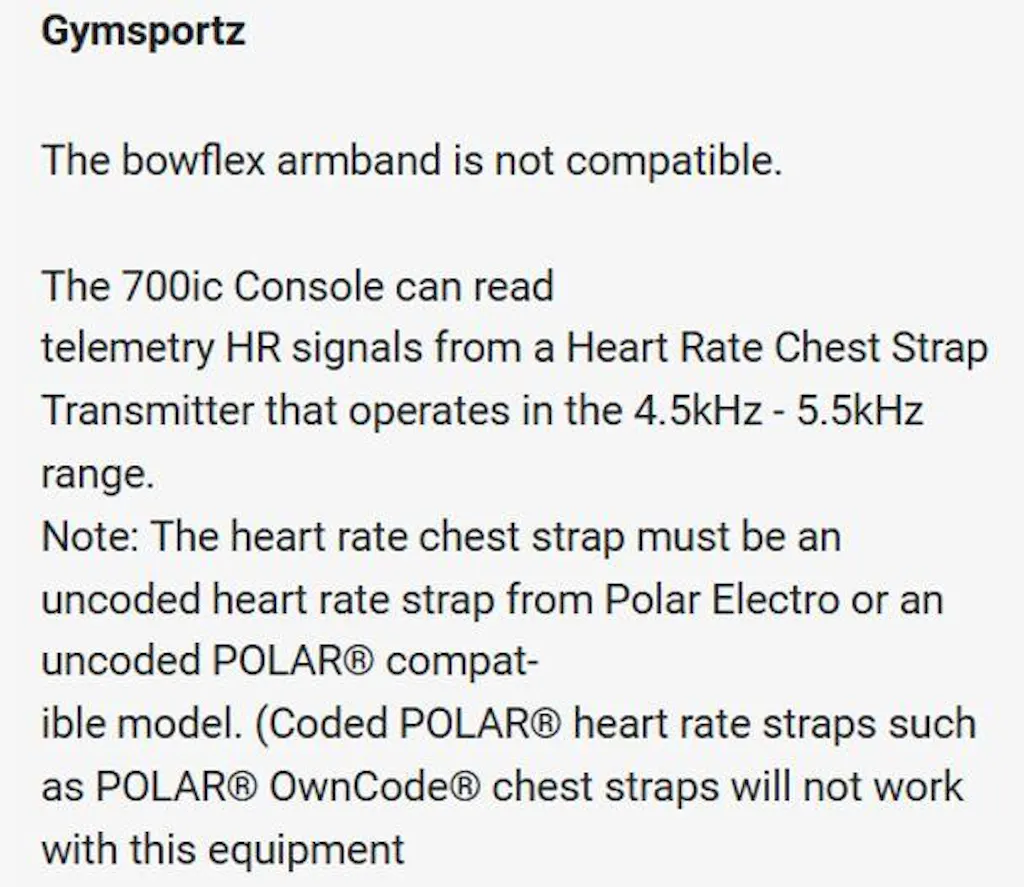 I sent an email to your company to clear up the confusion. The person replying confirmed that the Bowflex armband is not compatible with the 700IC. (S)he also said that the display reads an uncoded heart rate strap from Polar Electro or an uncoded POLAR compaible model in the 4.5kHz - 5.5kHz range (see attached screen grab). I understand this as I am a Physical Therapist and familiar with the Polar range of HRM. That person went on to say that I would have to purchase directly from Polar Singapore as GymSportz does not carry that item in inventory.