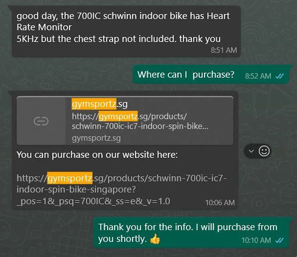 After Jason had delivered the bike and left my home, I sent a WhatsApp message to GymSportz at 8:51 am asking if I could purchase a rate heart monitor chest strap for the Schwinn 700IC. I was told I could purchase it from your company website (see attached screen grab).