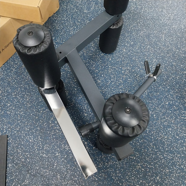 The Bodycraft F611 leg extension is specially designed as an attachment for the Bodycraft adjustable benches, including the F605 and F320. This leg extension attachment is ideal for users who wish to complete their workout with exercises such as leg extensions and leg curls. It features a locking leg hold down and a 6-roller design for comfort and efficiency. These rollers are covered in double-stitched industrial grade vinyl. The weight loader is angled upwards for additional safety. It accepts both standard (25mm) and Olympic (50mm) weights [Olympic adapter not included], and a 25mm spring collar clip to secure the weight plates.