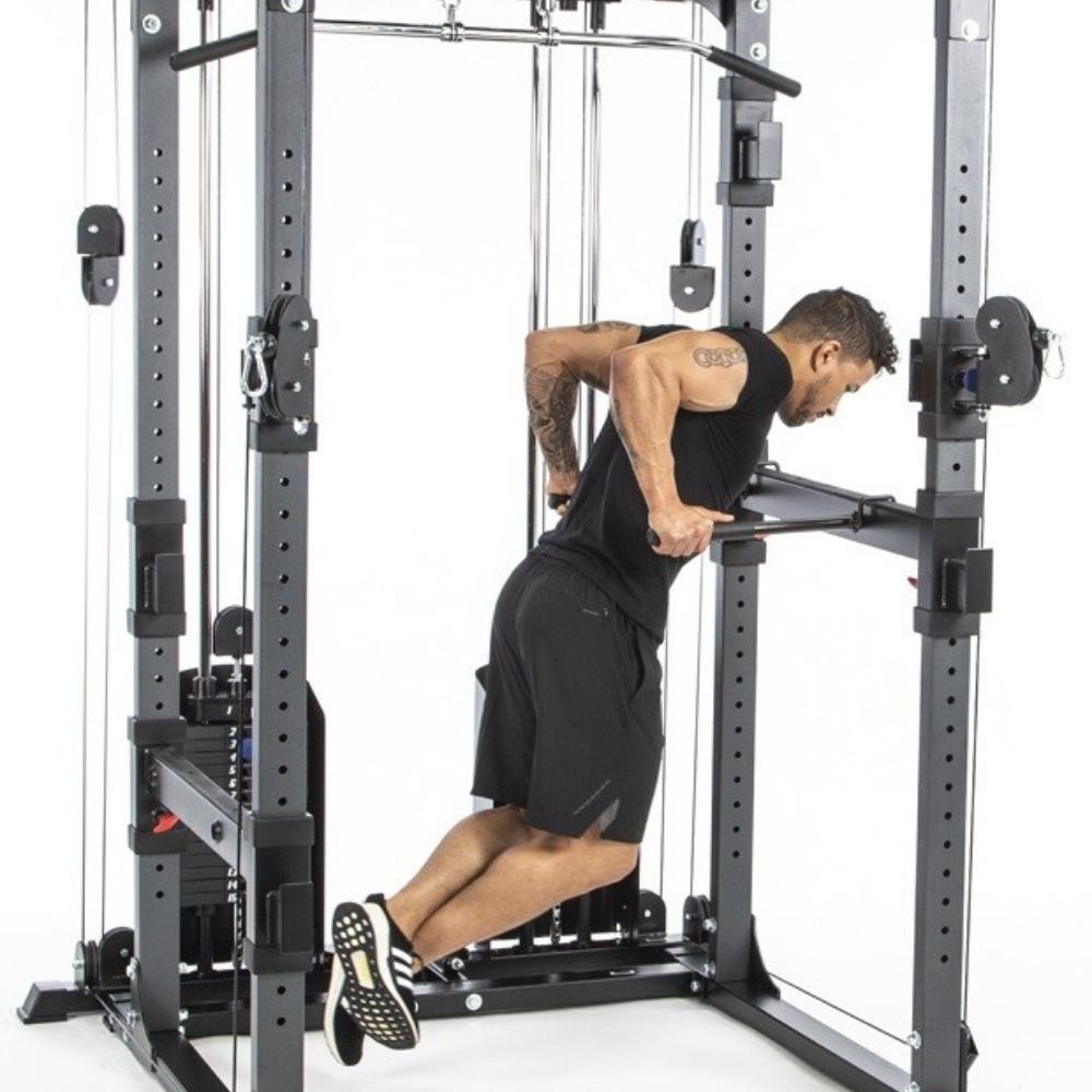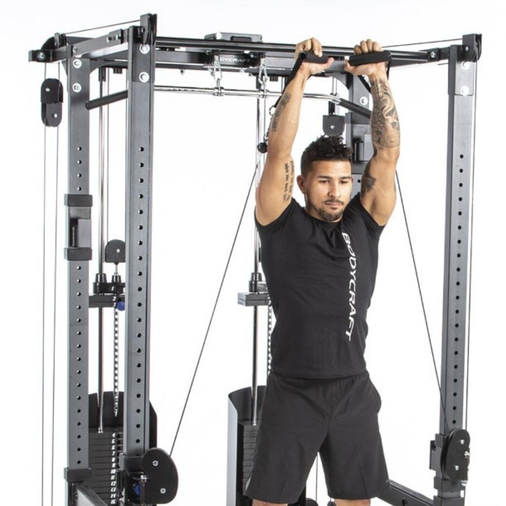 The Bodycraft RFT Functional Trainer is a comprehensive fitness system designed for demanding athletes who seek to push their limits with a wide range of exercises for a full-body workout. Featuring a sturdy, oversized frame constructed from high-quality steel, the RFT ensures exceptional stability and durability. The RFT is a fully functional power rack equipped with a chin-up bar, two sets of bar catches, and safety spotters with utility catches. Adjustments are made easy with pop-pins, allowing for tight 2-inch increments. Laser-etched numbers on the inside of the four uprights make setting your catches and spotters simple and accurate.