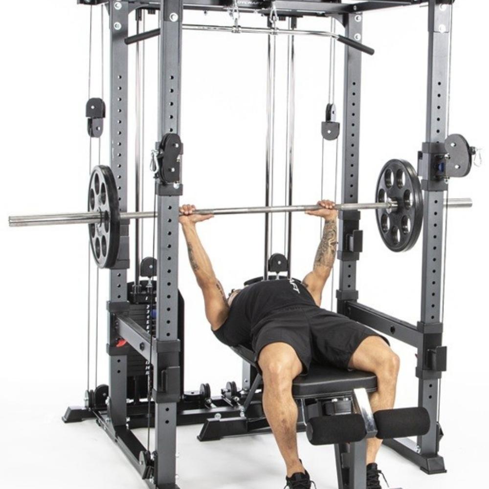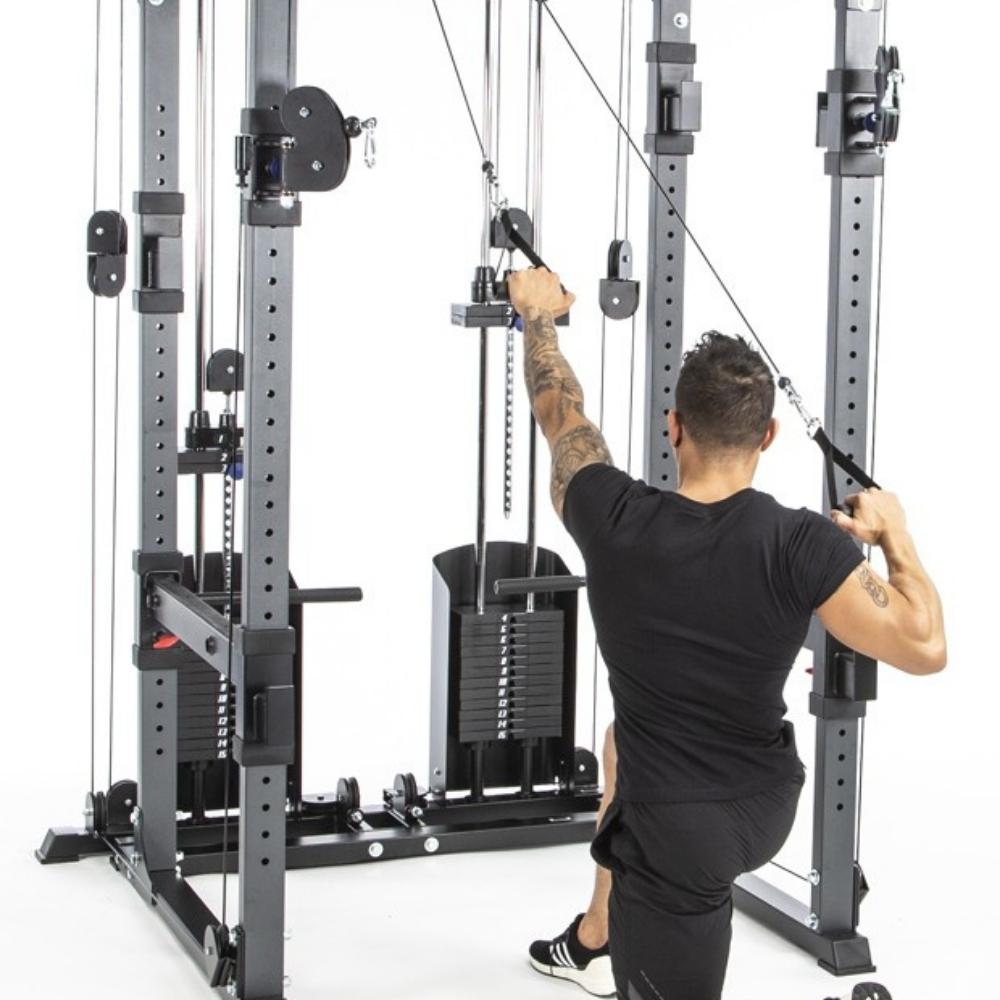 Extra FeaturesTriangular gusset reinforced upright frame. Vertical sliding J-hook and Spotters. 6 pulley cable machine.