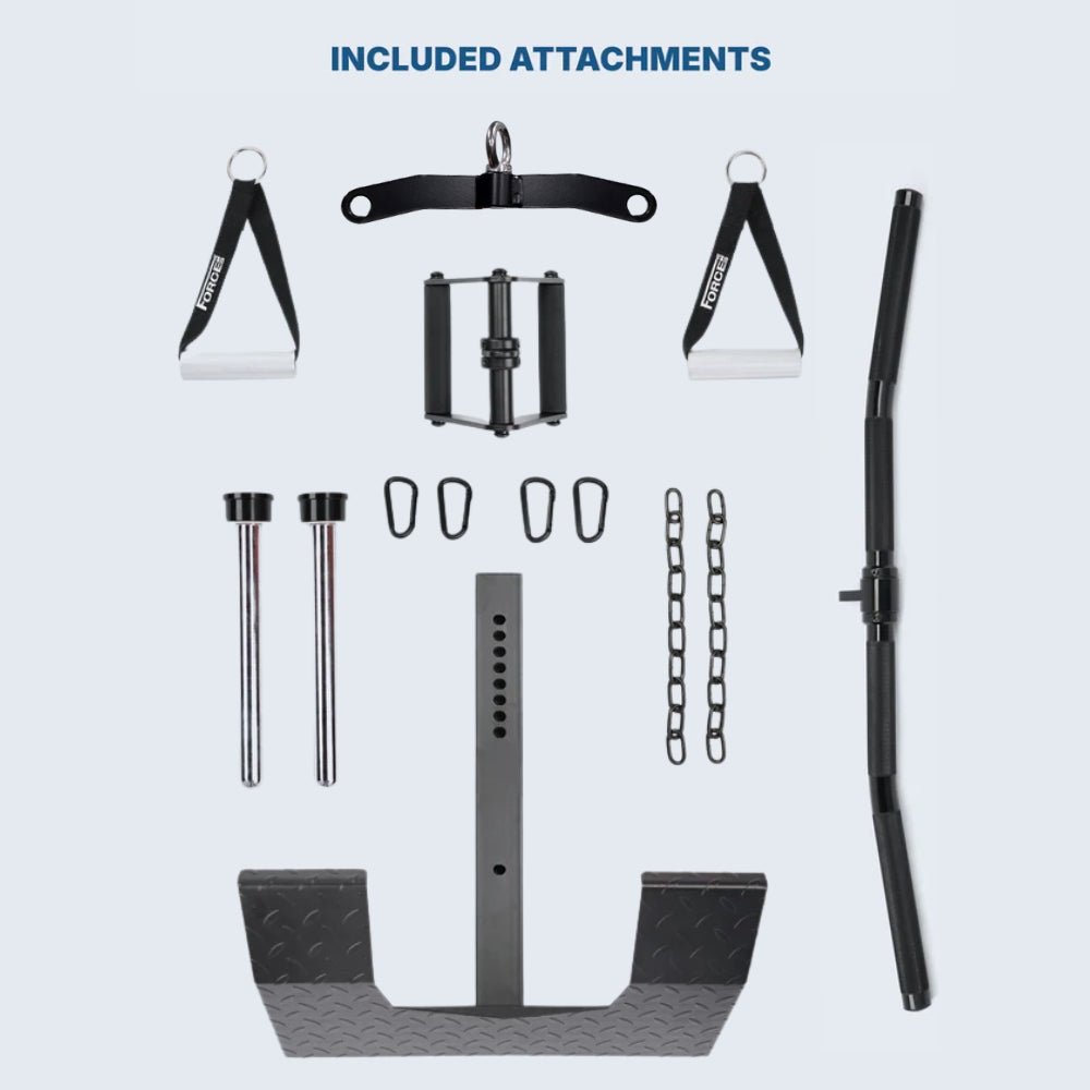 With single handles, pull down bar, low row foot plate, 4 Oval Black Carabiners, 2 Extension Chains, 2 Mag Pins and 1 Cable Connector, the Tandem Tower is packed with attachments that pays attention to details, usability and functionality.