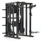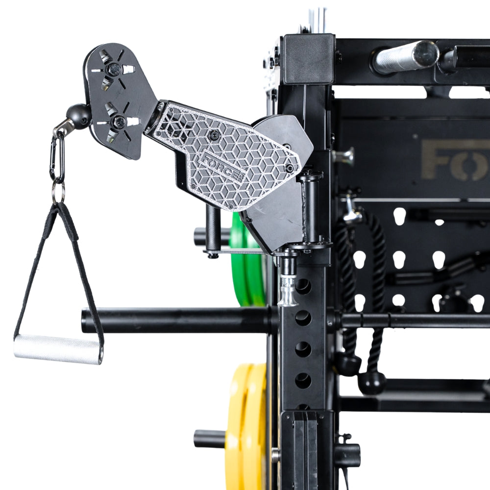 The innovation runs deeper. Freestyle pulley arms glide up, down, in, and out on upright trolleys, delivering a smooth 2:1 ratio. Dual **200 lb weight stacks—upgradeable to 300 lb—**power the center cable system through precision aluminum pulleys. Combine that with upper (1:1 / 2:1) and lower (1:2 / 1:1) pulley ratios, and you unlock true 90° lat pulldowns, low rows, and everything in between. The C20 is also packed with premium features: bold cornerstone accents on the cable trolleys, spotters, and J-hooks, adjustable chin-up handles, knurled aluminum dip handles, a magnetic landmine, a Smith bar with magnetic collars, eight weight storage horns with collars, a barbell holder, an integrated pegboard, and a range of knurled aluminum cable attachments.