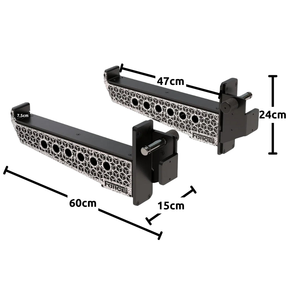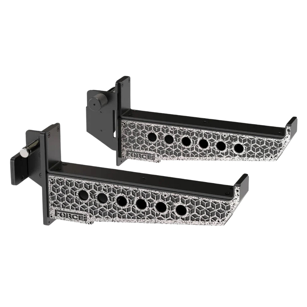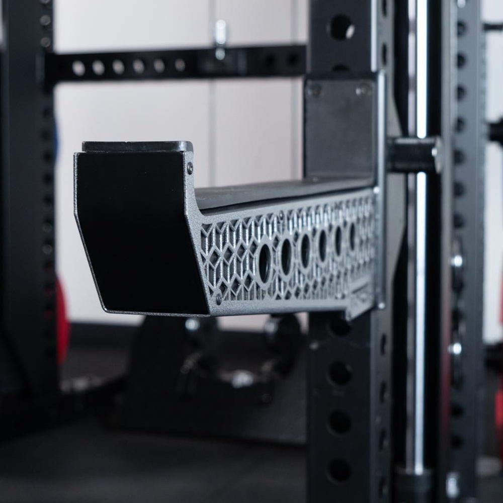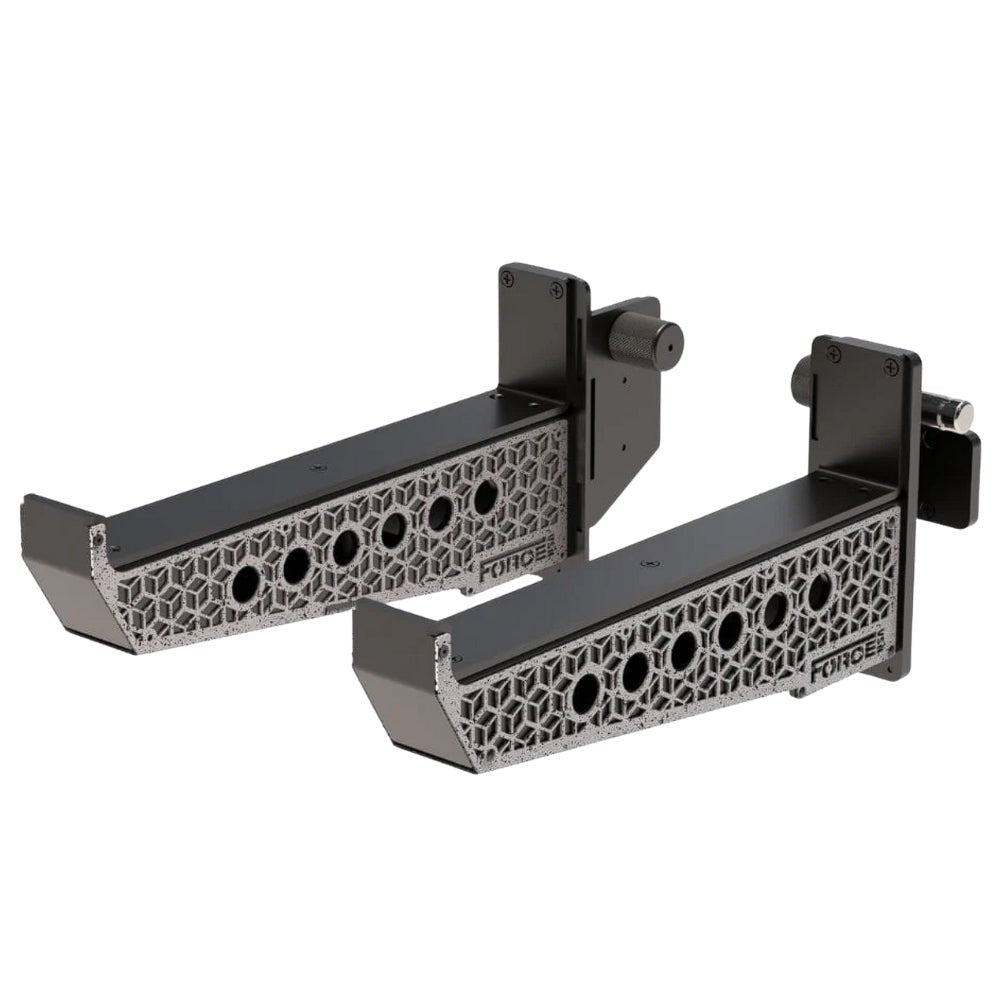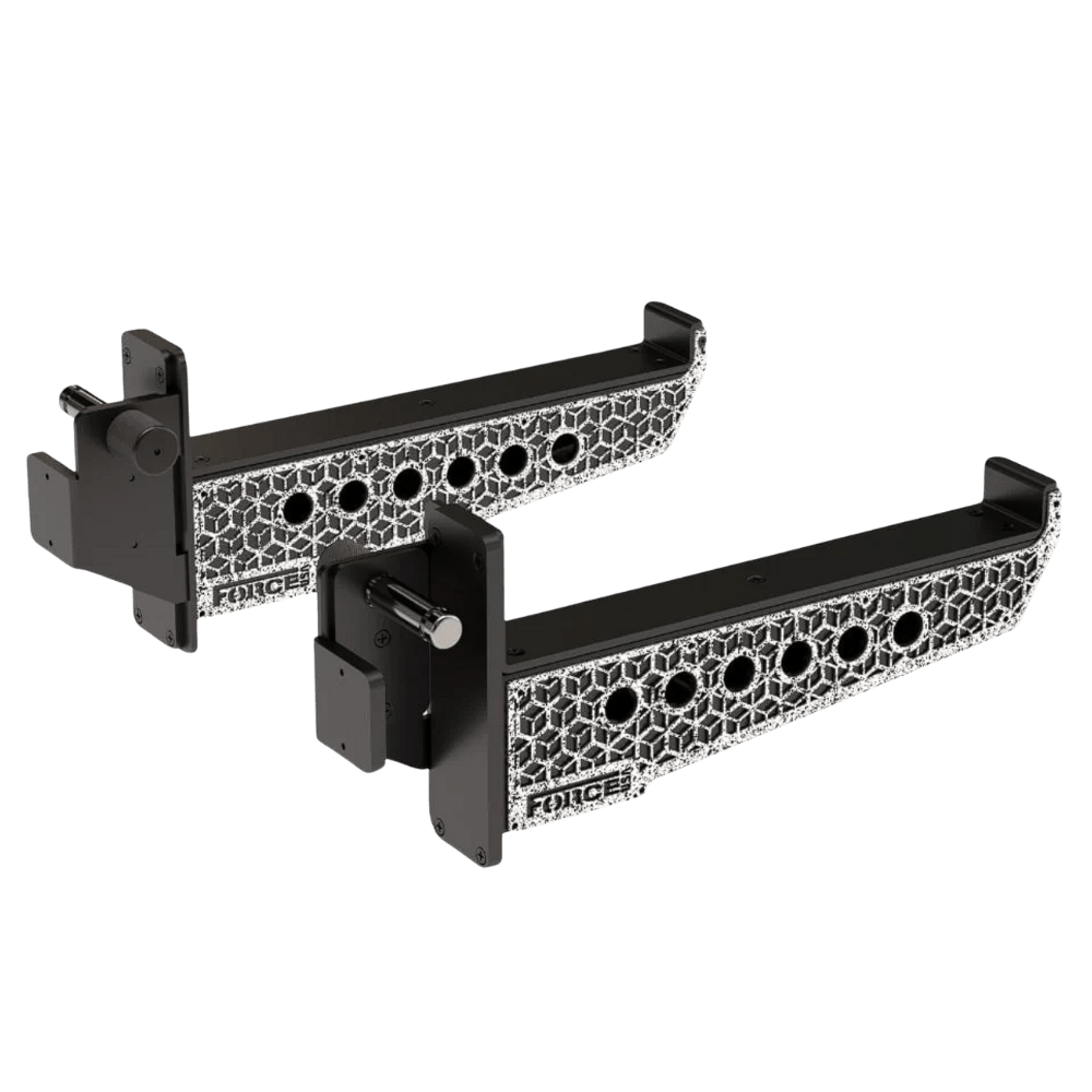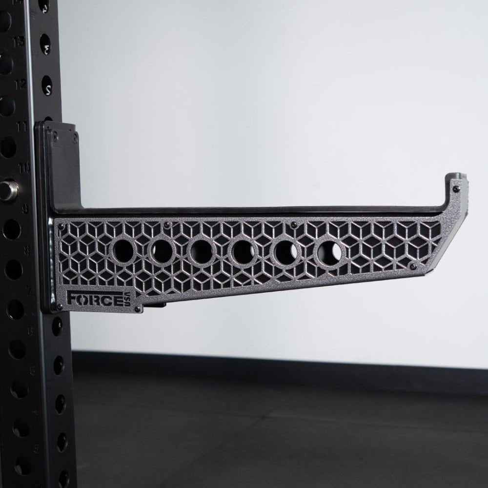 The Force USA Spotter Arm (In Pairs) (F-SPOTTER-3) is designed with signature Cornerstone cutout design elevates the look of your setup while preserving maximum structural strength. It’s a subtle, clean aesthetic that reinforces the rugged build you expect from Force USA. Heavy-duty knurled adjustment knobs double as ergonomic handles, giving you better grip and smoother control when shifting the spotter arms up or down the uprights. Even with the weight of the arms, adjustments feel faster, steadier, and more secure.