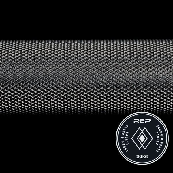 The Double Black Diamond Power Bar is REP’s top-tier powerlifting barbell with very aggressive knurling. REP was founded in Colorado, and the name "Double Black Diamond" references the steepest and hardest ski trail runs on the slopes. This 20kg (44.1lb) barbell features deep, mountain-style knurling to provide maximum grip for heavy bench presses and deadlifts, and center knurling to keep the barbell in place during back squats.