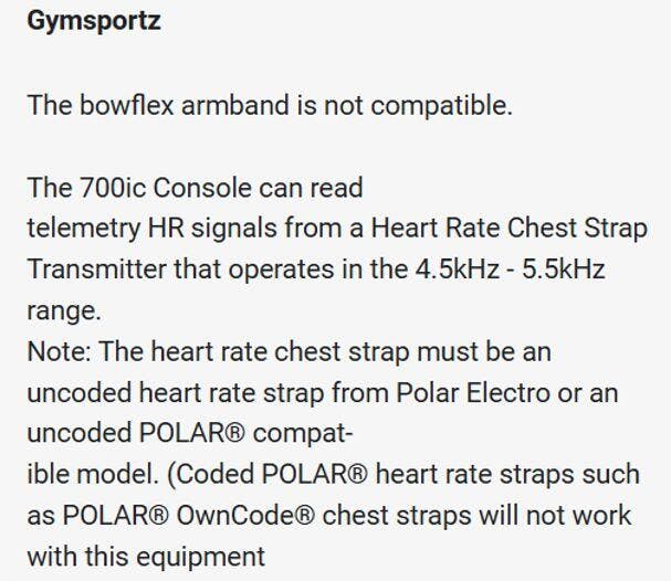 I sent an email to your company to clear up the confusion. The person replying confirmed that the Bowflex armband is not compatible with the 700IC. (S)he also said that the display reads an uncoded heart rate strap from Polar Electro or an uncoded POLAR compaible model in the 4.5kHz - 5.5kHz range (see attached screen grab). I understand this as I am a Physical Therapist and familiar with the Polar range of HRM. That person went on to say that I would have to purchase directly from Polar Singapore as GymSportz does not carry that item in inventory.