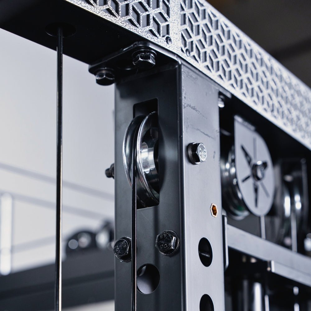 The innovation runs deeper. Freestyle pulley arms glide up, down, in, and out on upright trolleys, delivering a smooth 2:1 ratio. Dual **200 lb weight stacks—upgradeable to 300 lb—**power the center cable system through precision aluminum pulleys. Combine that with upper (1:1 / 2:1) and lower (1:2 / 1:1) pulley ratios, and you unlock true 90° lat pulldowns, low rows, and everything in between. The C20 is also packed with premium features: bold cornerstone accents on the cable trolleys, spotters, and J-hooks, adjustable chin-up handles, knurled aluminum dip handles, a magnetic landmine, a Smith bar with magnetic collars, eight weight storage horns with collars, a barbell holder, an integrated pegboard, and a range of knurled aluminum cable attachments.