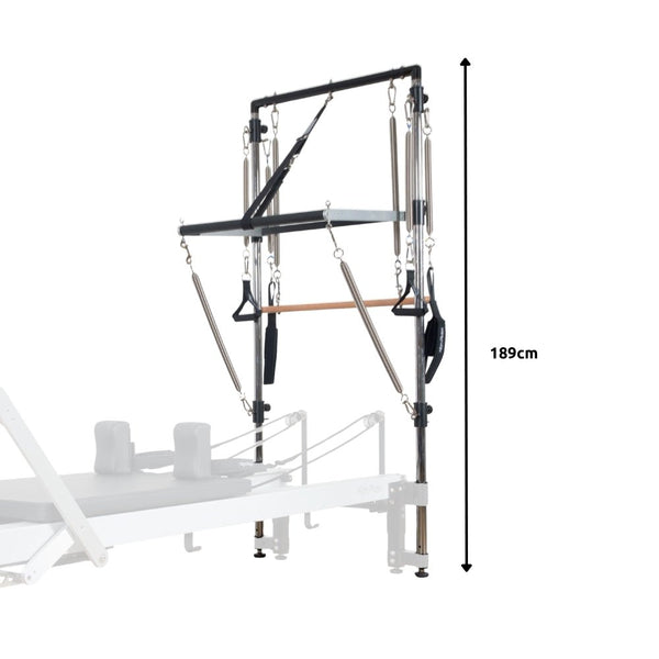 Crafted with a stainless steel frame and dedicated to fit the Align C8-Pro Reformer, the Half Cadillac ensures a harmonious and efficient setup. It comes equipped with a Swing Through Bar, a Roll Down Bar, and sliding eyelets, allowing for multiple planes of resistance and a diverse exercise repertoire. The unit is available for purchase alongside a new reformer or as an upgrade to existing equipment and is compatible with all leg height options.