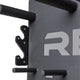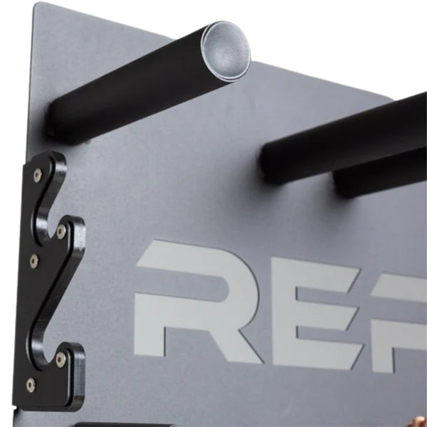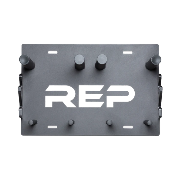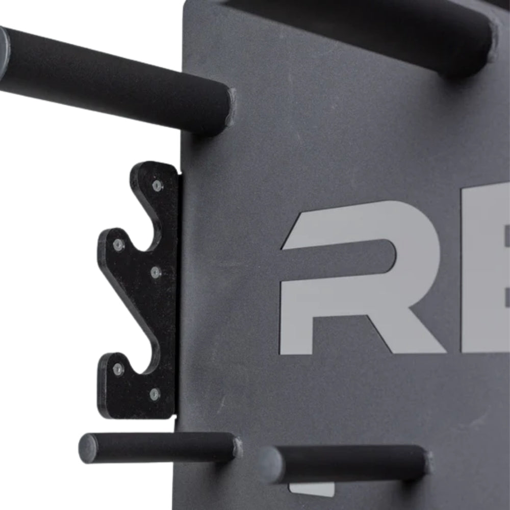 The REP Wall Mounted Gym Storage Rack (WS-4000) saves floor space by allowing you to store a variety of equipment on your home gym wall. It features space on top for Medicine Balls or Slam Balls; two “gun rack” slots to hold barbells; and four lower pegs to hang your bands, collars, jump ropes, chains, lifting belt, straps, and more.